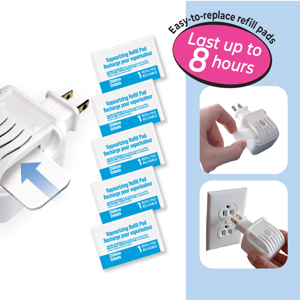 - Kids Relief® Plug-In Waterless Vaporizer releases a blend of non-medicated aromatic vapors to soothe your child while they rest. The easy-to-replace refill pads last up to 8 hours. Plug in the vaporizer - it operates quietly.